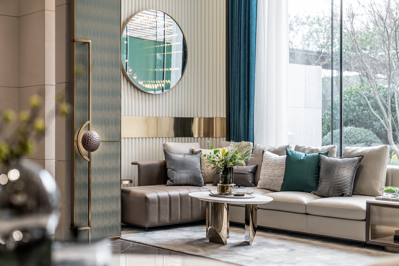 Stylish lounge seating and tables, create welcoming reception area, balance comfort modern design.